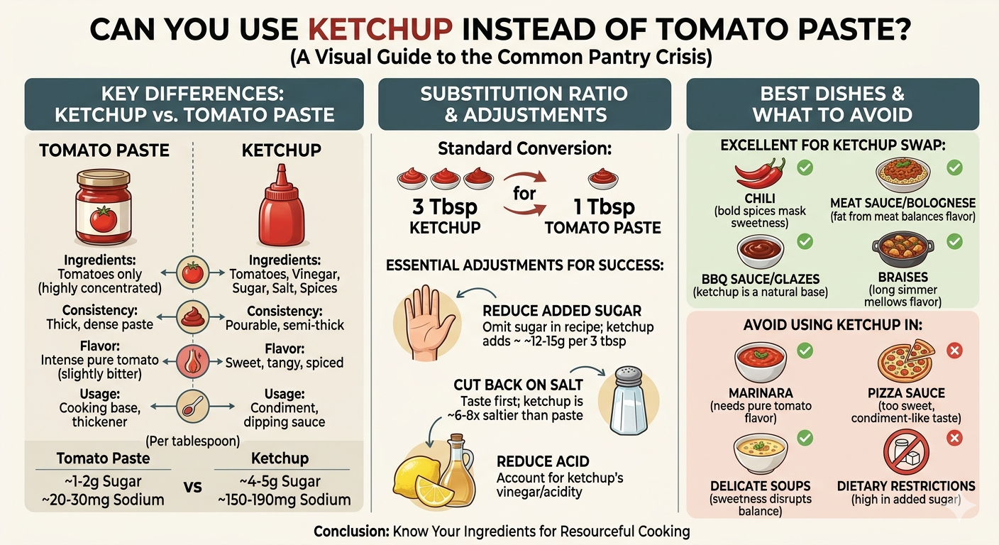 Kyllä – voit käyttää ketsuppia tomaattipastan sijaan ripaus, mutta se muuttaa annoksesi makua, makeutta ja koostumusta. Keskeisten erojen ymmärtäminen auttaa sinua muokkaamaan reseptiäsi ja saavuttamaan parhaan mahdollisen tuloksen.
